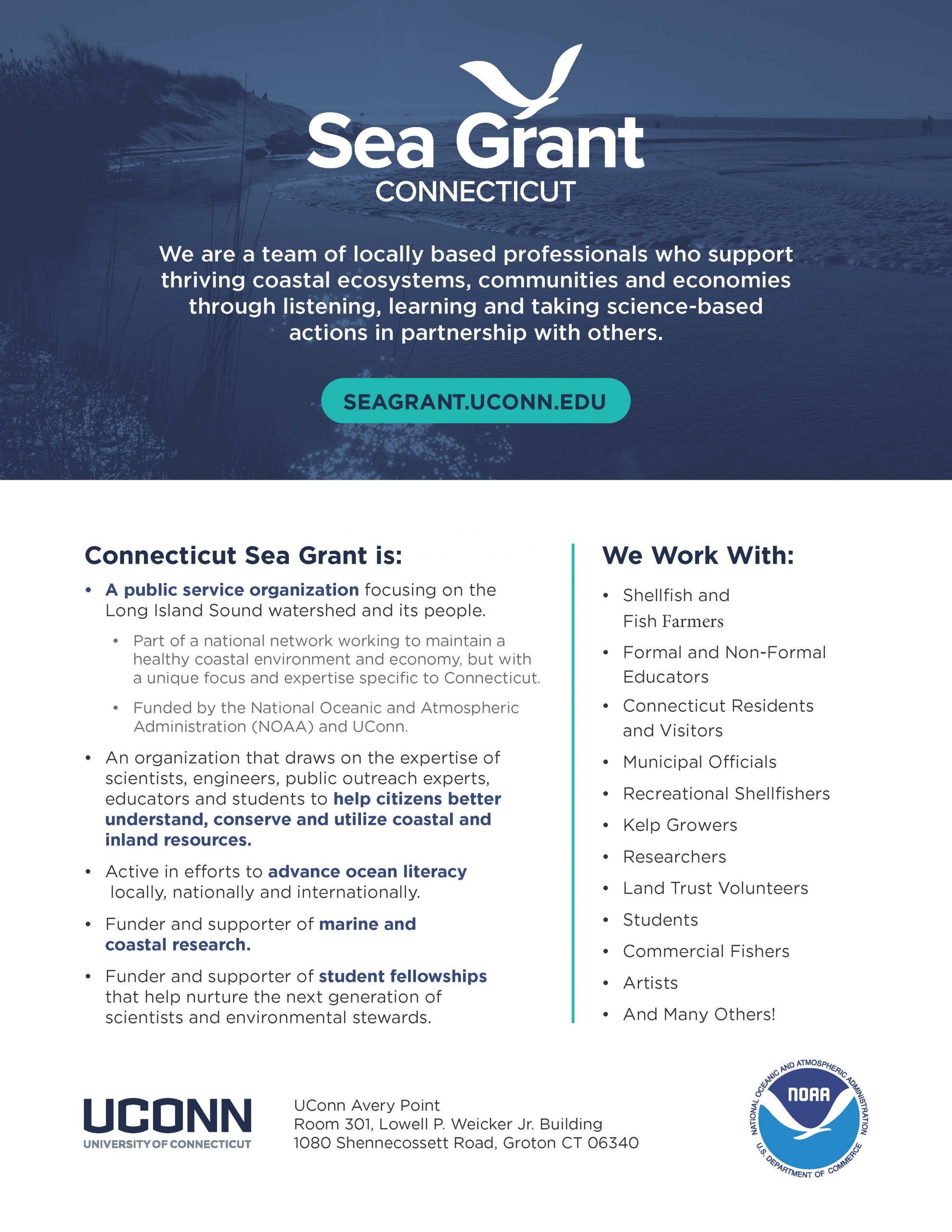 Connecticut Sea Grant College Program University of Connecticut - Avery Point,  Lowell P. Weicker Jr. Building 1080 Shennecossett Road,  Groton, Connecticut 06340 Email: seagrant@uconn.edu